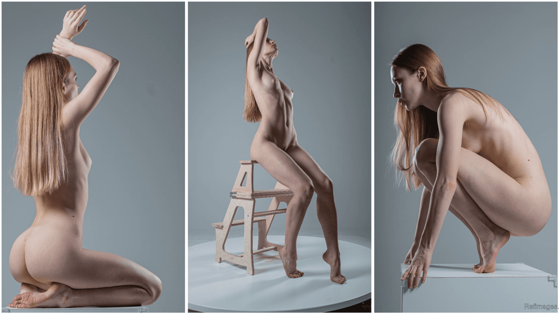 The set includes multiple camera angles, clean studio lighting, and clear silhouettes, making it perfect for studying proportions, structure, and form. You’ll also find poses using simple props such as blocks and stools, helping artists understand weight distribution and body mechanics.